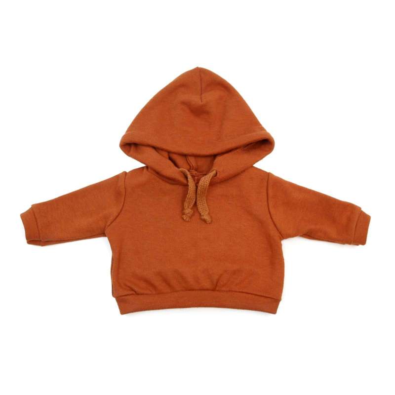 Denne hoodie i blødt sweatshirt-materiale har hætte og bindebånd. Hoodien passer til alle Leo, Leonora, Maria og Pablo dukker fra As og er som alt tøj i miks og match kollektionen fra Memories by As håndsyet. Her ses hoodien i modefarven rust.